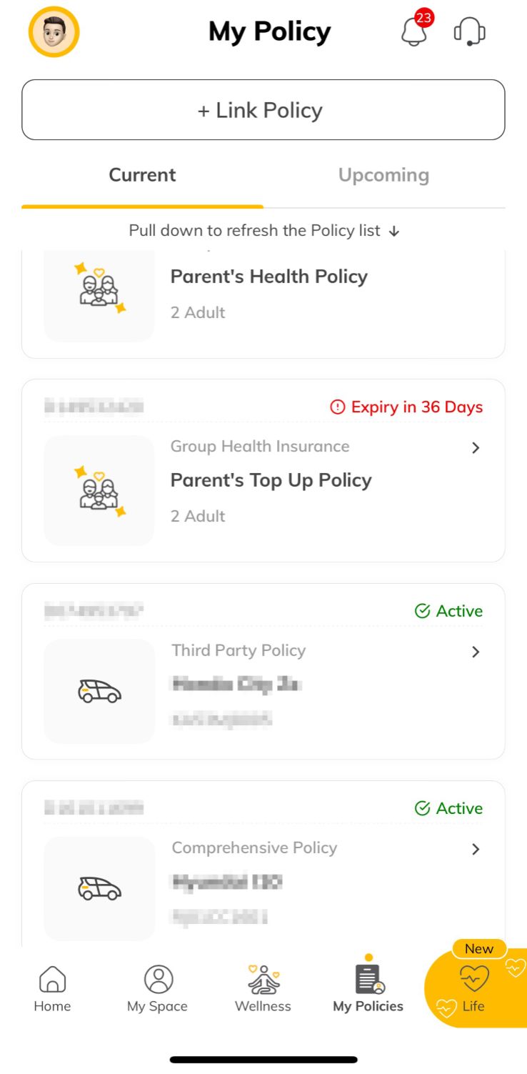 Step 1 - On the Digit app, go to the ‘My Policies’ tab at the bottom of the screen. You will see all your current policies.